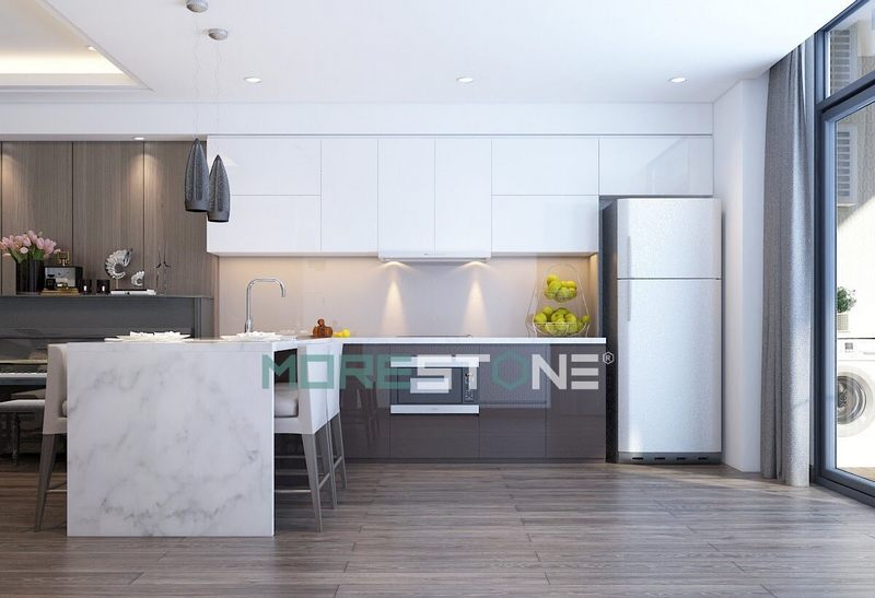 Đá ốp bếp cao cấp có độ cứng cao và khả năng chống xước tốt, giúp ngăn chặn sự phát sinh của ố bẩn trong quá trình sử dụng.