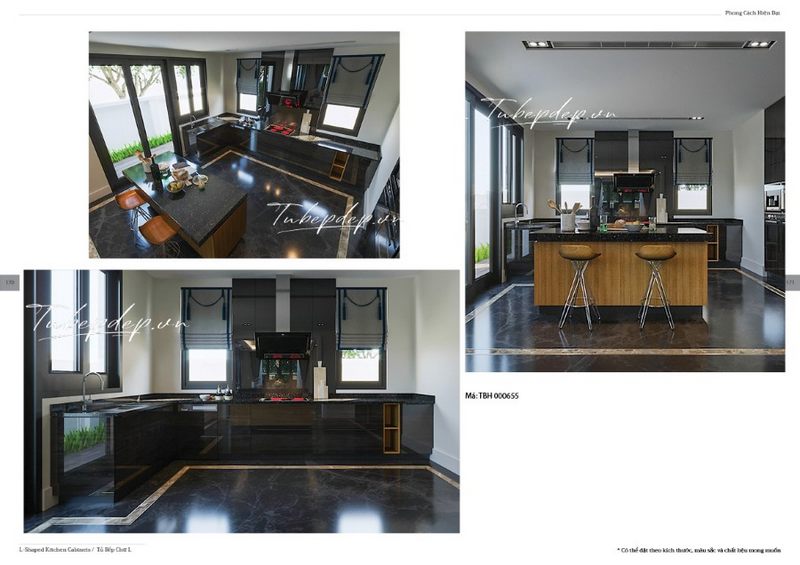 . Tủ bếp acrylic màu đen đồng màu với đá ốp mặt bàn và sàn nhà tạo nên một không gian đồng bề. Bàn đảo độc lập ốp gỗ tự nhiên vàng làm nổi bật và tạo điểm nhấn sang trọng cho không gian.
